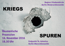 Der Friedensweg in der Form einer ökumenischen Prozession beginnt um 18.30 mit einer Besinnung in der Friedenskirche Niederschöneweide. Wir machen Station beim Dokumentationszentrum NS-Zwangsarbeit und auf dem Kaisersteg. Der Friedensweg endet mit Austausch und Gebet in St. Antonius in Oberschöneweide; Ende gegen 20.00 Uhr. In diesem Jahr schließen wir uns dem Thema „Kriegsspuren“ der Friedensdekade an. Jede und jeder von uns kennt Menschen, die unter den Folgen eines Krieges gelitten haben und leiden.