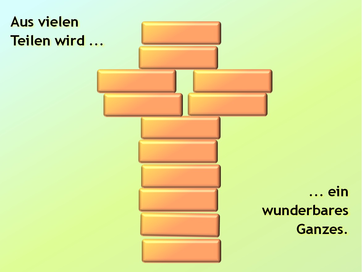 Baustein-Gottesdienst – das heißt: viele aus der Gemeinde bringen sich zu diesem Thema mit einem kleine Beitrag ein. So wie aus vielen Steinen ein Haus erwächst.