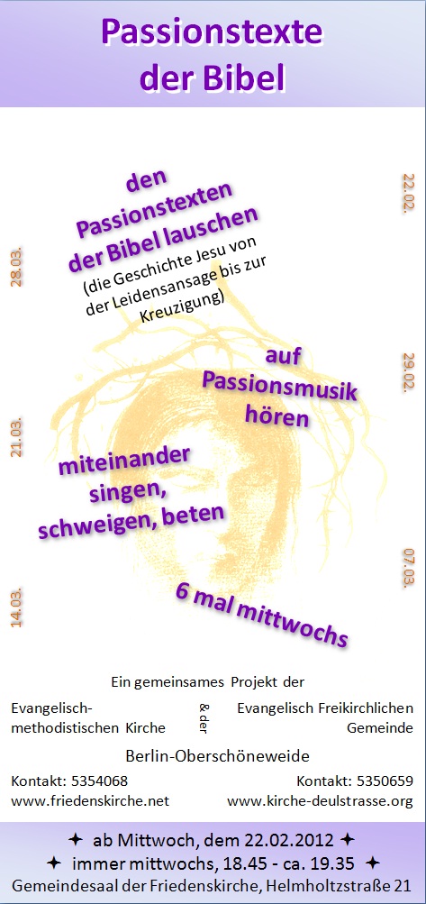 In der Passionszeit finden sechs besondere Abende statt – Passionstexte der Bibel. Es geht darum, sich Zeit zu nehmen um die Geschichte Jesu Christi bis zum Kreuz auf sich wirken zu lassen. „Passionstexte der Bibel“ ist ein gemeinsames Projekt der Evangelisch Freikirchlichen Gemeinde Deulstraße und der Evangelisch-methodistischen Kirche Oberschöneweide. An jedem Abend lesen drei Personen Texte des Alten Testaments, die auf das Leiden eines Gottesknechtes hinweisen, vor allem aber die Stationen Jesu von der ersten Leidensankündigung bis zur Grablegung. Wer schon einmal die Bibel gut gelesen gehört hat, weiß, wie beeindruckend das ist. Die Abende finden immer mittwochs von 18.45 bis ca. 19.30 statt. Ort: Gemeindesaal der Friedenskirche, Helmholtzstraße 21. Die Passionstexte der Bibel beginnen am Aschermittwoch und enden am 28. März.
