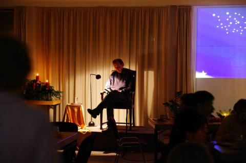 Dienstag, 18. Dezember, 19.00 Uhr. Das kleine Café. Beim Reinkommen: Erwartungsvolles Gemurmel. Der Geruch von Zimt und Lebkuchen steigt in die Nase. Die Tische sind adventlich-festlich geschmückt. Vorne der Lesestuhl, auf dem in zwanzig Minuten Matthias Zehrer Platz nehmen wird. Gäste vom Vorjahr kleinen Café war, stoßen die Nachbarn an: „Mensch, das war klasse im letzten Jahr!“ Oder: „Wie der gelesen hat, und die Geschichten!“ Oder: „Super, die Advents- und Weihnachtslieder zu singen.“ Das, und vieles mehr, ist Das kleine Café am 18. Dezember. Ein gemütlicher Leseabend mit Matthias Zehrer. Bei adventlichen Getränken und Gebäck werden Weihnachtsgeschichten bekannter und weniger bekannter Autoren vorgetragen. Wir laden ein zum Mitsingen bekannter Advents- und Weihnachtslieder. Oder auch nur gemütlich dazusitzen.