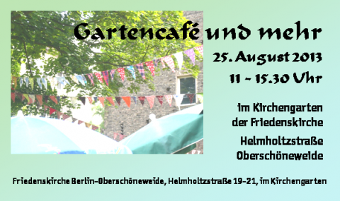 Am 25. August laden wir zum Gartencafé und mehr ein. Ein Sonntag mit quirligem Leben. Von 11 bis 14.30 Uhr gibt es viele verschiedene Angebote: ein Gartencafé mit richtiger Caféhausmusik (live), Spiele für die Kinder, Grillwurst und mehr, Getränke satt, eine Bastelstraße, die zu kreativem Gestalten einlädt, die große gemeinsame Singaktion „Der Kiez singt“ (lassen Sie sich angenehm überraschen), Spielzeugtauschbörse und Vieles mehr. Um 14.30 Uhr laden wir herzlich ein zum Open-Air-Gottesdienst unter dem Motto „Lebendiger Garten“. >> Den 25. August freihalten! Es lohnt sich!