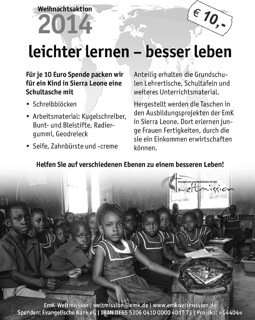 Leichter lernen — besser leben. Unter diesem Motto steht die Weihnachtskation der Evangelisch-methodistischen Kirche. Die Friedenskirche beteiligt sich an dieser tollen Aktion. Im Gottesdienst an Heiligabend wurde gesammelt, 2.380 Euro kamen zusammen! Es ist immer noch möglich sich zu beteiligen. Wie viele Schultaschen wollen Sie spenden? Die Menschen in Sierra Leone brauchen dringend unsere Solidarität. Vor einigen Jahren noch Bürgerkrieg und Kindersoldaten, jetzt Ebola…