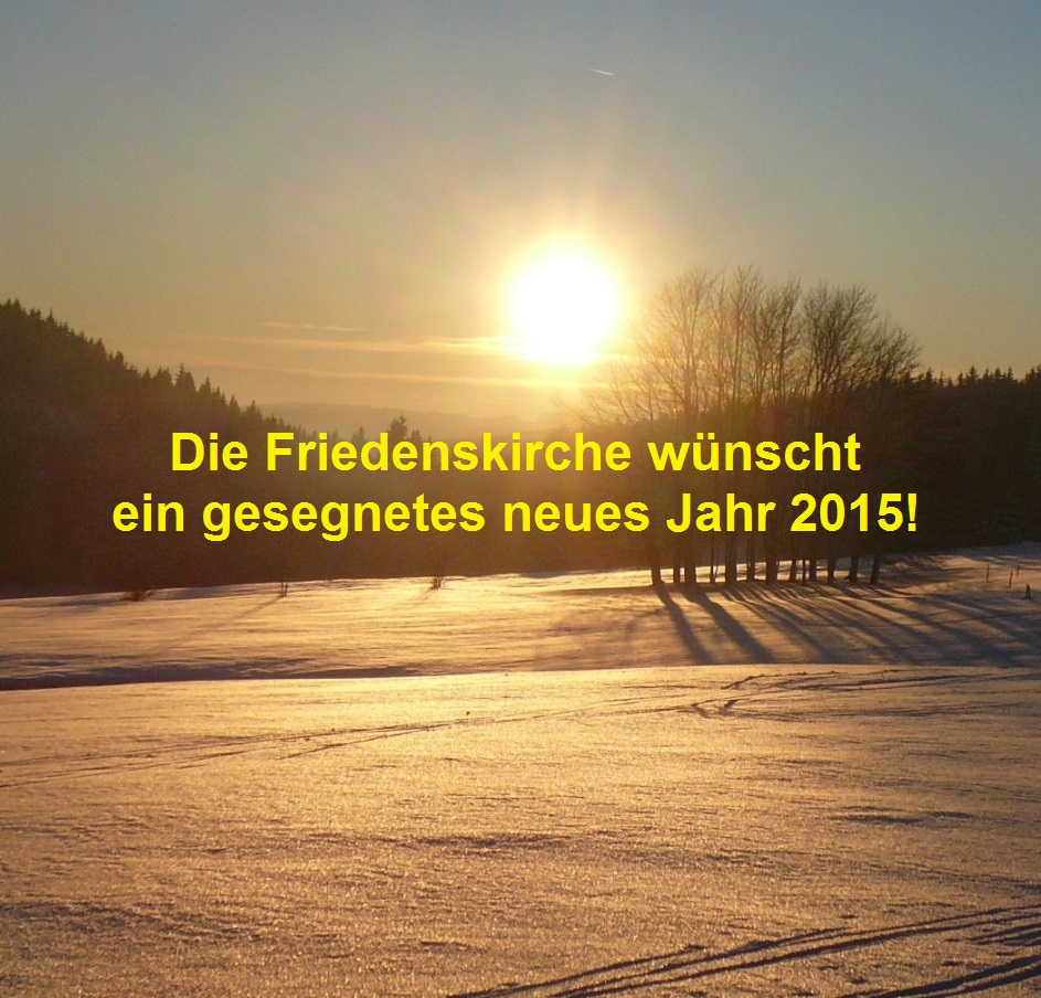 Wir wünschen allen ein gutes, von Gott gesegnetes neues Jahr! Am Ende des Gottesdienstes heißt es oft: Gott segne dich und behüte dich. Gott lasse sein Angesicht leuchten über dir und sei dir gnädig. Gott wende sich dir in Liebe zu und gebe dir Frieden. Dies wünschen wir Ihnen für den Übergang ins neue Jahr 2015. Ihre Friedenskirche.