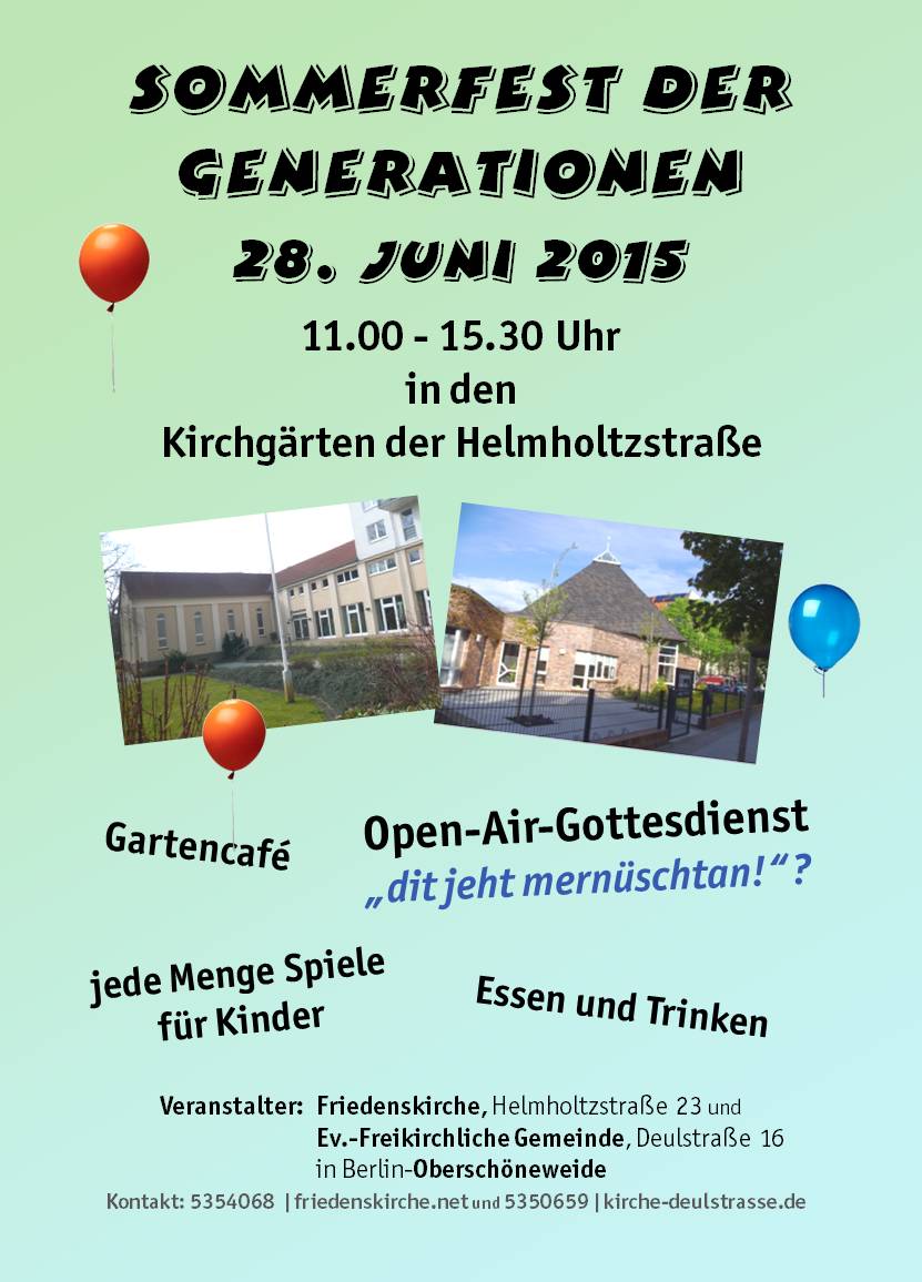 Datum: Sonntag, 28. Juni 2015 - 11:00Ort: Kirchengarten um die FriedenskircheSommerfest der Generationen. Stände. Aktionen. Buntes Bühnenprogramm. Open-Air-Gottesdienst. Freude am Leben. Freude an der Begegnung. Freude an Gott. Kategorien: Angebote Kalender