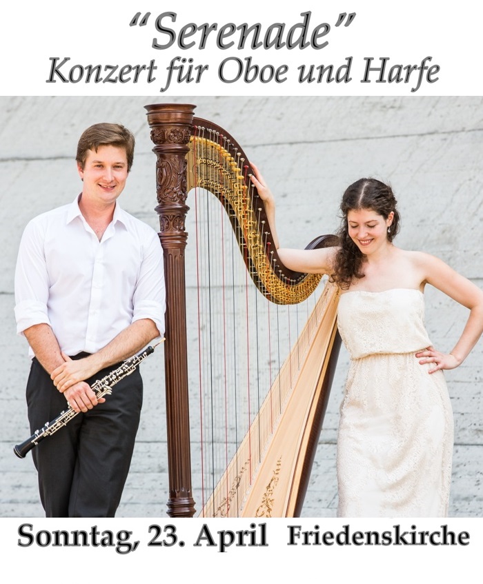 Das Konzert für Harfe und Oboe am 23. April in der voll besetzten Friedenskirche war ein Hochgenuss! Die jungen Künstler Jessica Flemming, Harfe, und Mykyta Sierov, Oboe musizierten Werke von Barock bis zur keltischen Musik und von Gershwin bis Rimski-Korsakow. Das Konzert war ein Genuss; eine Teilnehmerin sagte: „Ich gehe berührt und beschwingt nach Hause.“ Außerdem gab es viel zu sehen: Frau Flemming erläuterte, wie eine Harfe funktioniert, man durfte die Harfe sogar anfassen. Ein herzliches Dankeschön an die beiden Künstler!
