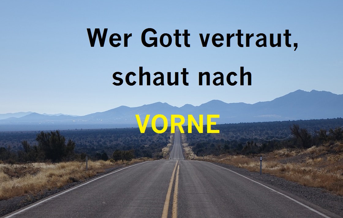 Herzliche Einladung zum Gottesdienst! Vor Gott zur Ruhe kommen. Segensreiche Worte hören. Zeit zum Beten und Nachsinnen. Gemeinschaft mit Gott und Menschen beim Abendmahl erleben. Neue Impulse bekommen. Das Thema der Predigt heute: Wer Gott vertraut, schaut nach vorne. Lassen Sie sich herausfordern! – Sonntag ist Gottesdienst. Tun Sie sich was Gutes.