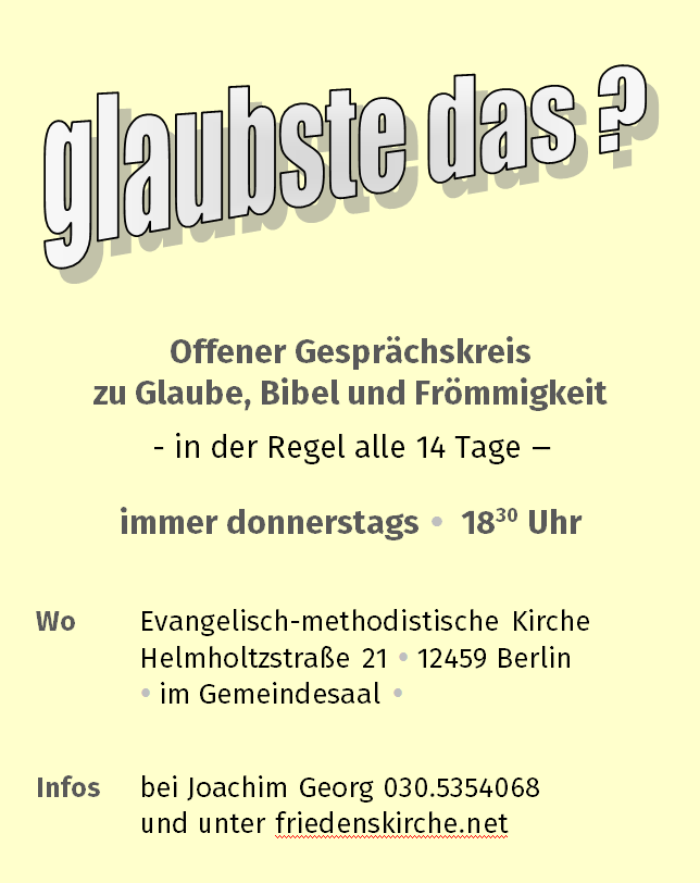 Heute um 18:30 Uhr laden wir wieder herzlich ein zum offenen Gesprächskreis zu Fragen über Glauben, Bibel, Frömmigkeit, über „Gott und die Welt“. – Jede Frage ist willkommen. Menschen mit allen Ansichten sind willkommen. – Der nächsten Termine in und nach den Sommerferien werden bekannt gegeben.
