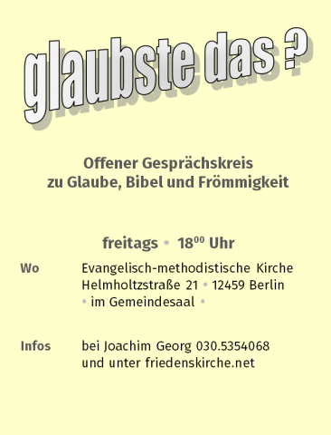 Offener Gesprächskreis heißt: Menschen unterschiedlicher Überzeugungen unterhalten sich über Fragen zu Glaube, Bibel, Leben, Frömmigkeit usw., also über „Gott und die Welt“. Jede*r und jede Frage ist willkommen; denn die Gruppe setzt sich jedes Mal neu zusammen. — Treffpunkt im Gemeindesaal der Friedenskirche, Zeit: 18.00 Uhr bis ca. 19.30 Uhr. – Herzlich willkommen! — Bringen Sie Ihre Fragen mit und reden Sie mit!